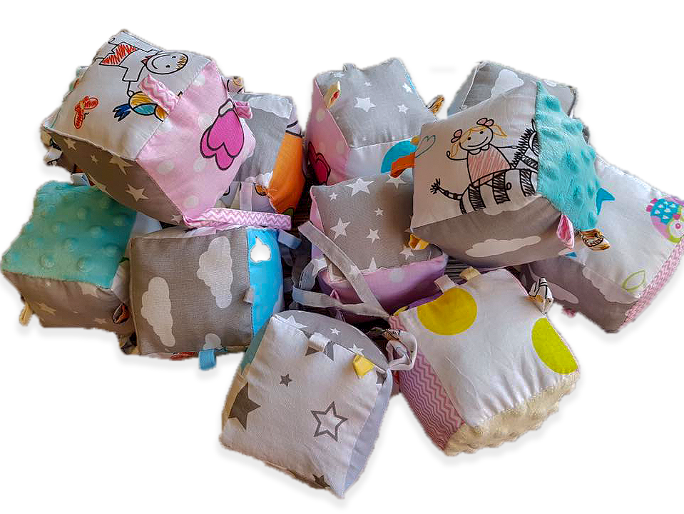 Mekane didaktičke kocke izrađene od 100% pamučne tkanine. Kocke na sebi imaju ušivene razne trakice.