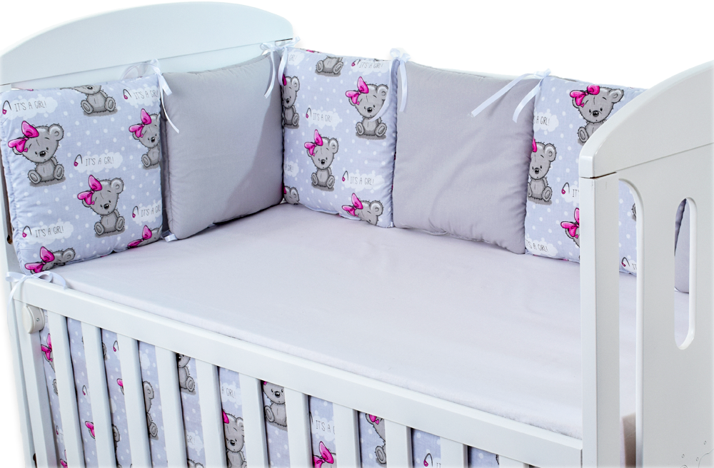 Zaštitna ogradica sastoji se od 6 jastučića (3 jastučića u dezenu it’s a girl i 3 jastučića sive boje).